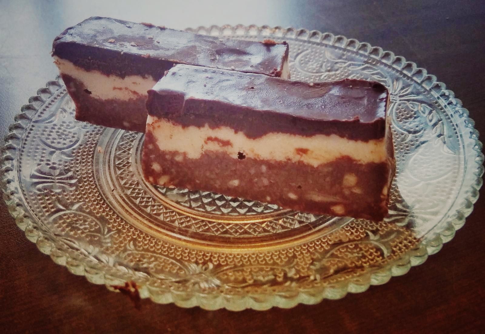 ממיסים במיקרוגל שוקולד מריר והשמנת מתוקה ויוצקים על השכבה השניה .